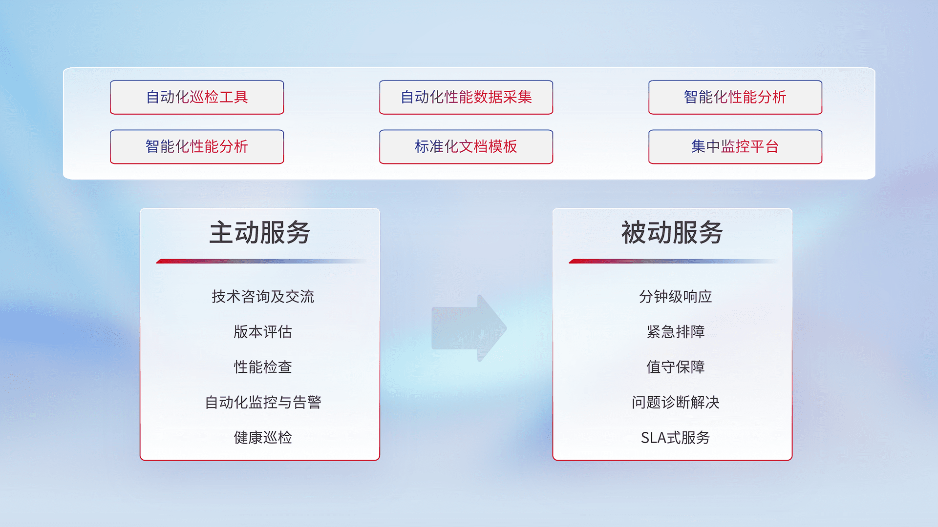 智能化工具和标准化文档,,,保障服务质量,,提供主动服务(包含技术咨询、、版本评估、、、、性能检查、、自动化监控与告警、、、、健康巡检)和被动服务包含(分钟级响应、、、、紧急排障、、值守保障、、、问题诊断解决、、、SLA服务)。。。